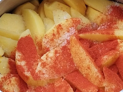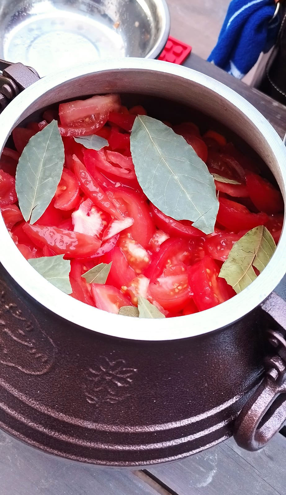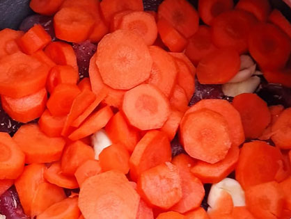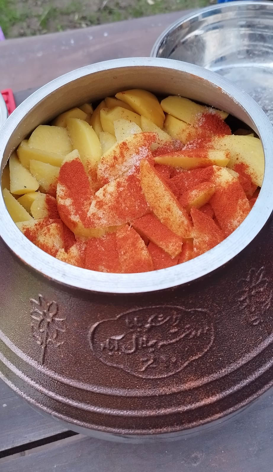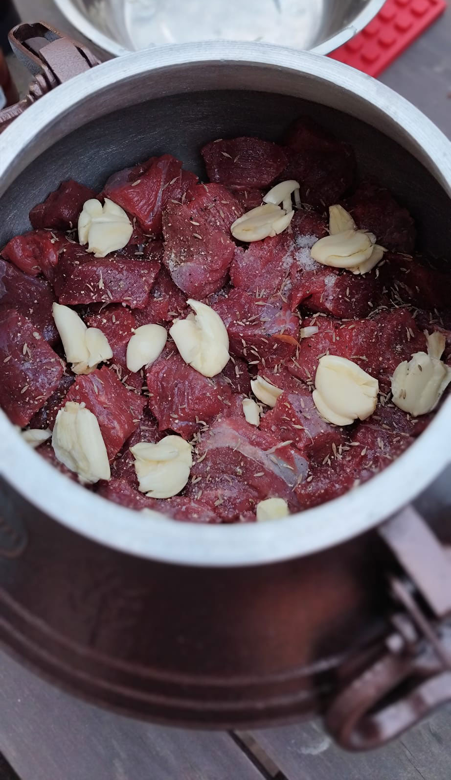 Послойно выкладываем ингредиенты. Подушка из лука (полукольцами). Мясо крупными кусками (соль, перец, зира, шафран). Чеснок. Морковь крупными кольцами (лаврушка). Томат крупными дольками. Болгарский перец полосками. Картофель дольками (соль, копченая паприка). Добавляем литр воды.