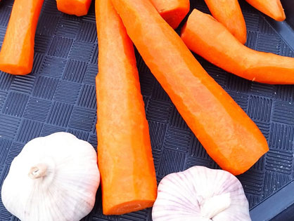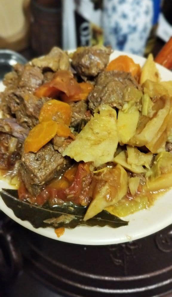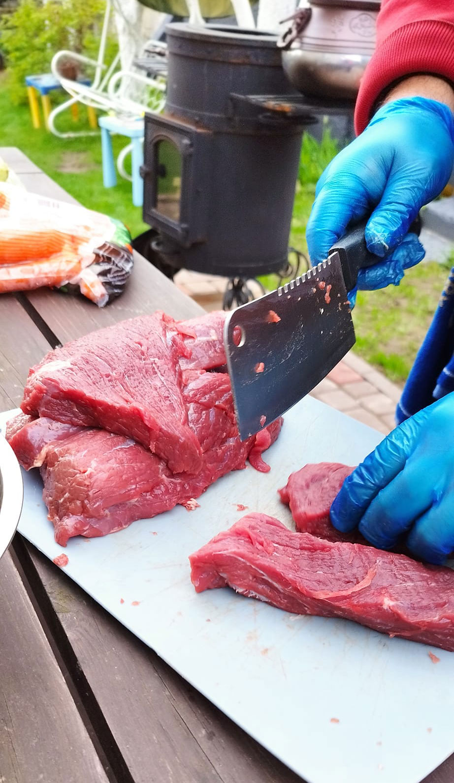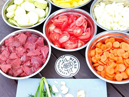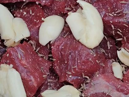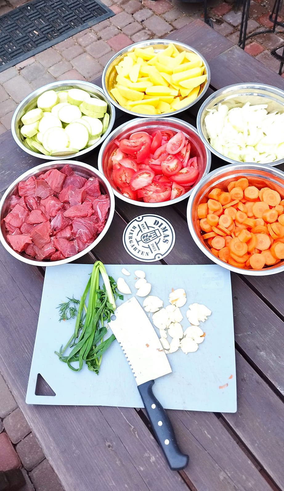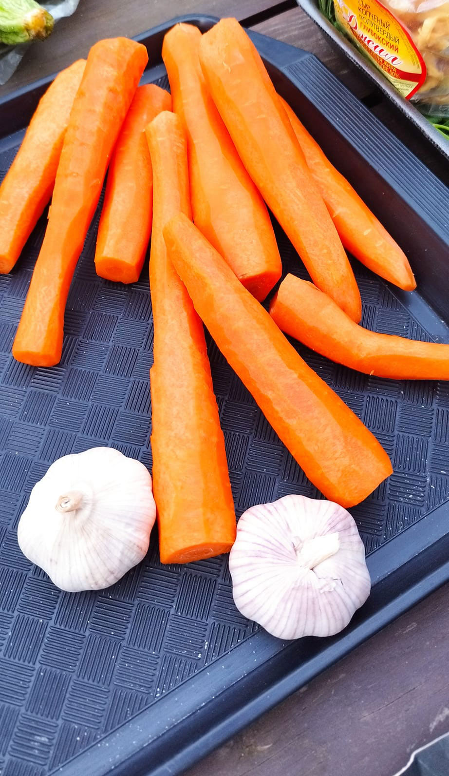 Послойно выкладываем ингредиенты. Подушка из лука (полукольцами). Мясо крупными кусками (соль, перец, зира, шафран). Чеснок. Морковь крупными кольцами (лаврушка). Томат крупными дольками. Болгарский перец полосками. Картофель дольками (соль, копченая паприка). Добавляем литр воды.
