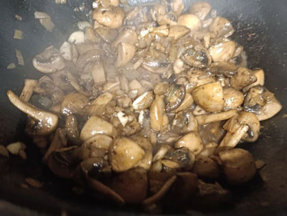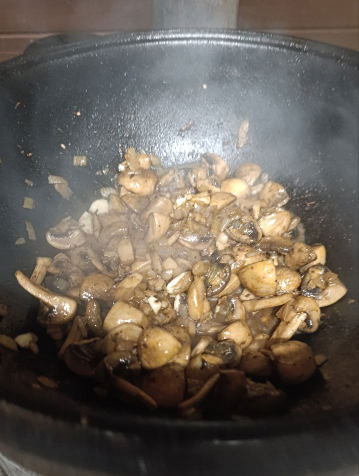 Разогреваем казан и добавляем подсолнечное масло. Пассируем лук. Добавляем шампиньоны, чуть не дожариваем, солим и добавляем жаренный чеснок. Снимаем.