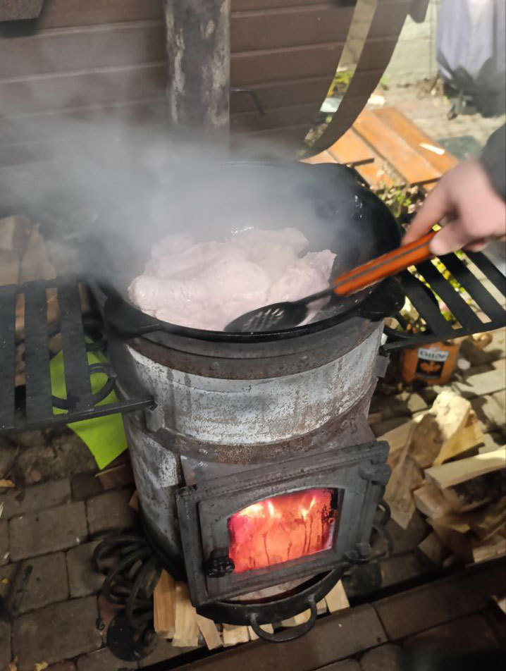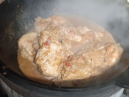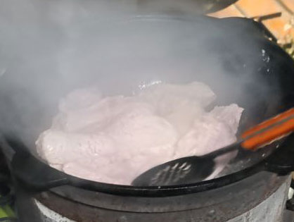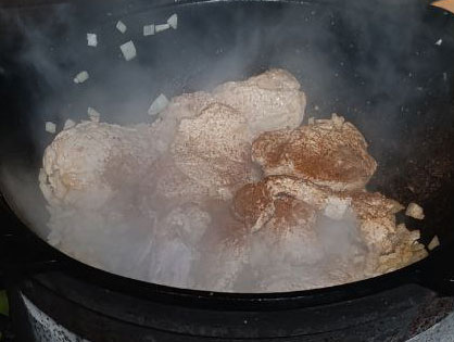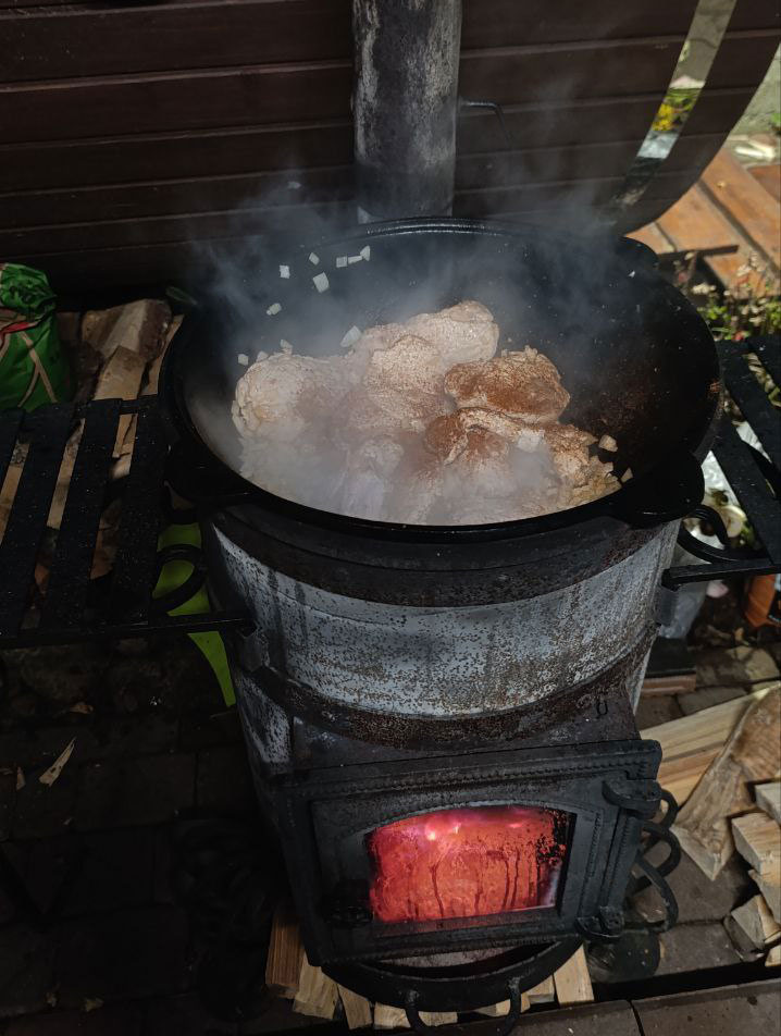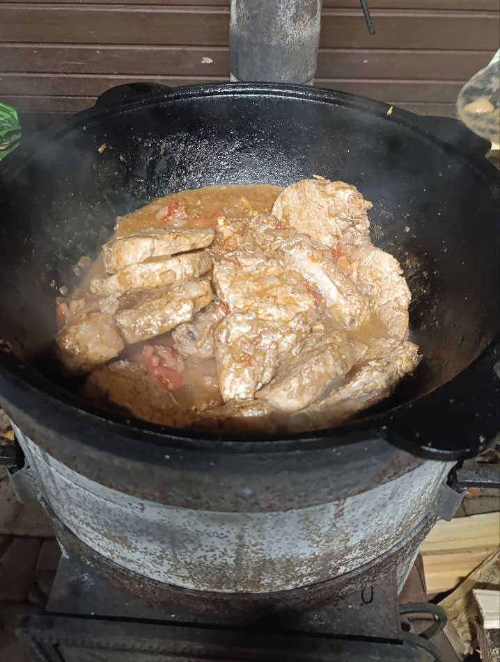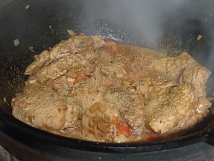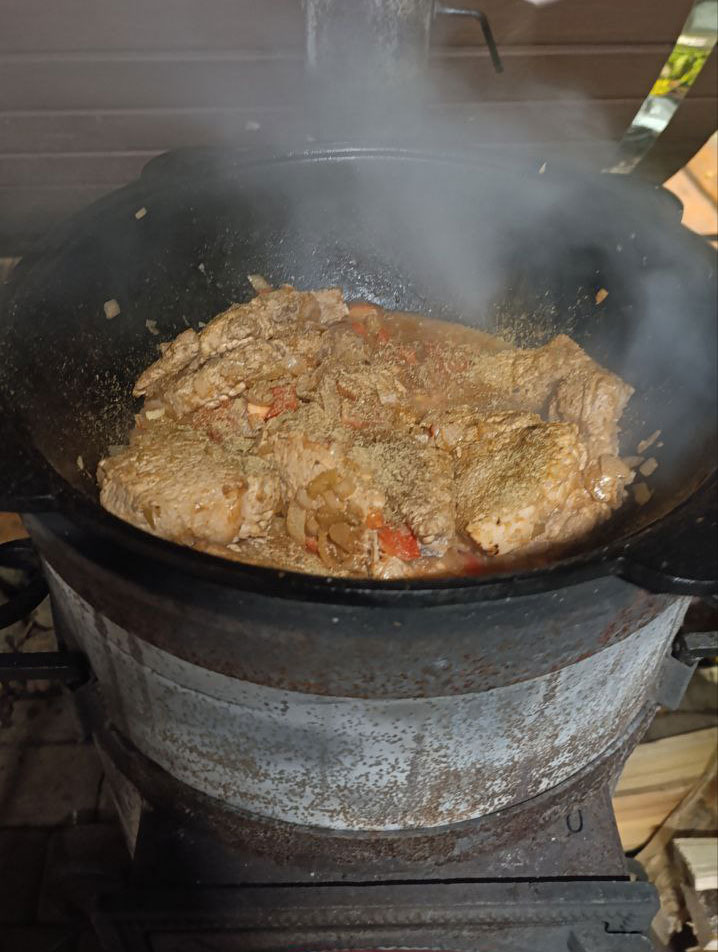 Разогреваем казан и добавляем подсолнечное масло. Добавляем картофель чуть не дожариваем. Солим, добавляем копченую паприку. Снимаем с казана.