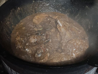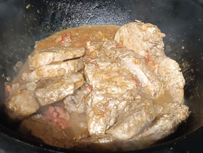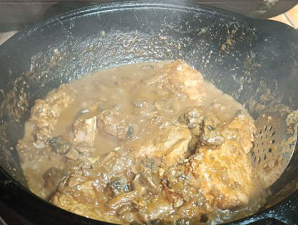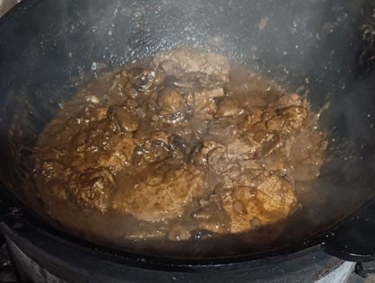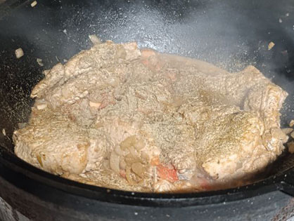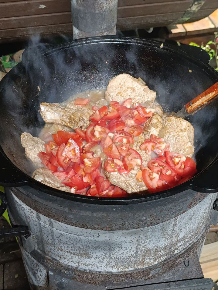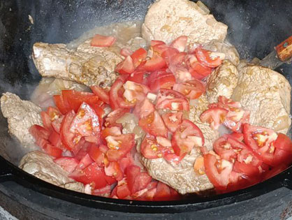 Добавляем немного масла и запечатываем мясо. Солим, перчим, зира, копченая паприка, хмели-сунели. Добавляем лук. Как лук начнет растворяться, добавляем томаты. Тушим под крышкой. Когда подлива начнет выпариваться, добавляем грибы. Подтушиваем все вместе 10-15 минут под крышкой.