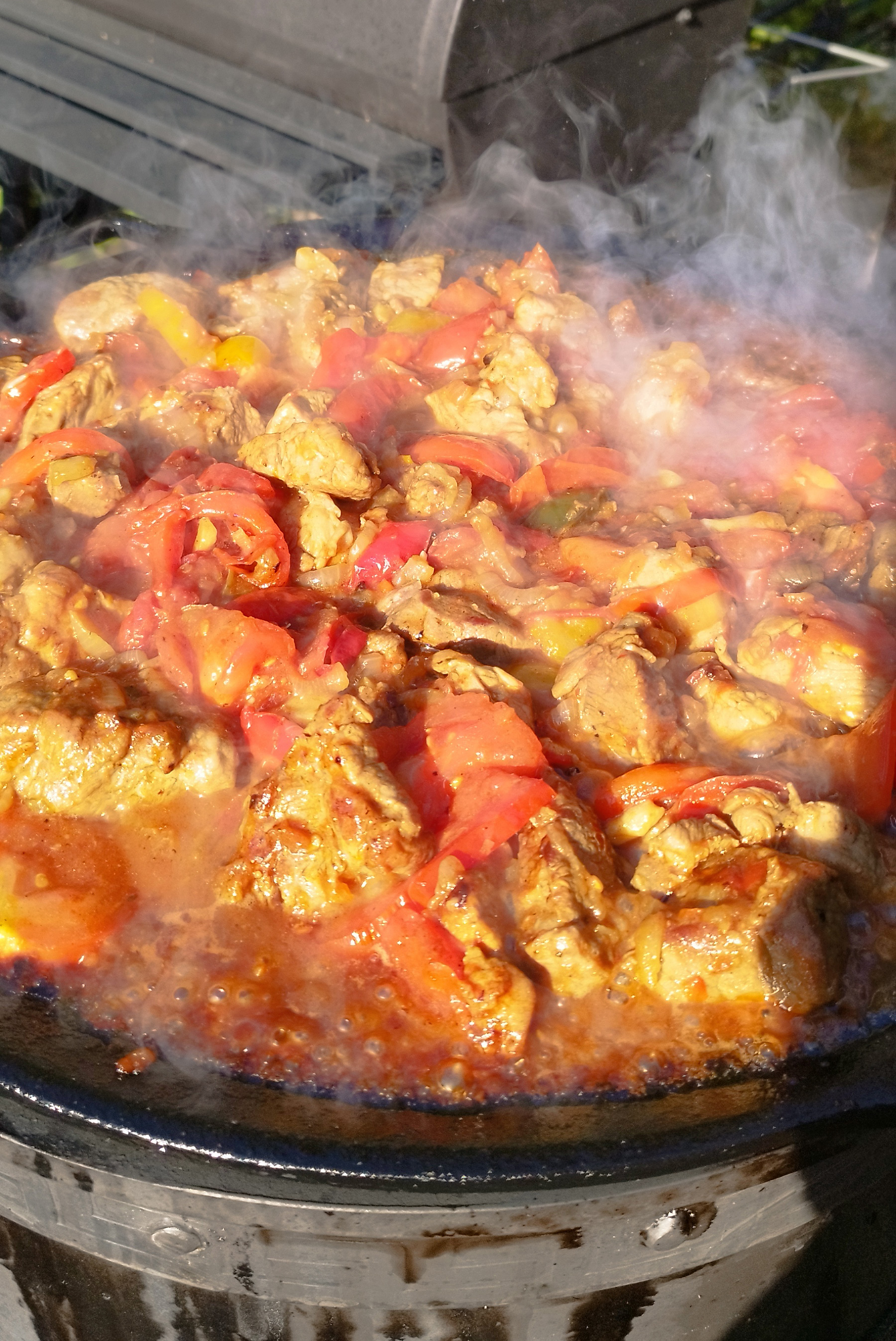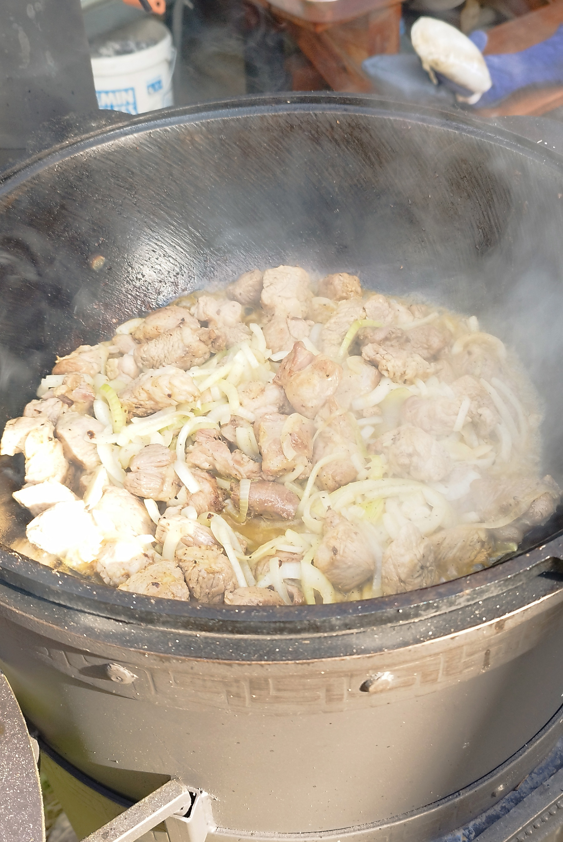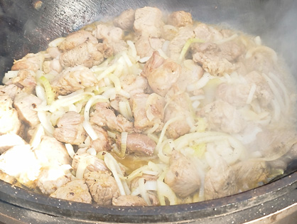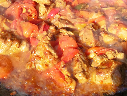 Заворачиваем мясо на большом огне, солим, перчим. Уменьшаем огонь и добавляем лук. Чуть позже чеснок. Затем томаты. Хмели-сунели.