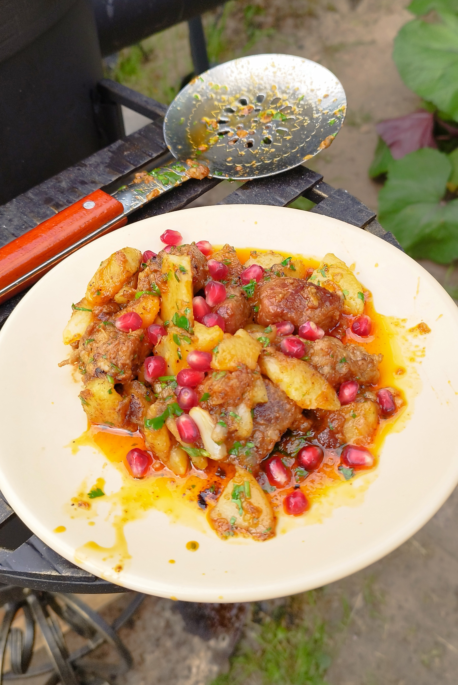 Тушим мясо, возвращаем картофель и перемешиваем. Добавляем кинзу/базилик, смешиваем и снимаем с огня.