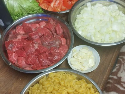 Нарезаем мясо мелкими кусками, морковь крупной соломкой, репчатый лук полукольцами, томаты дольками, перо лука колечками. Давим чеснок.
