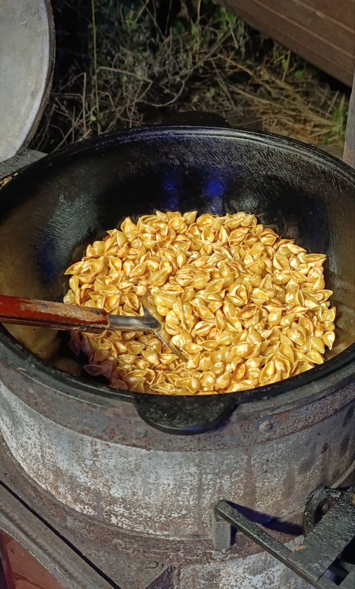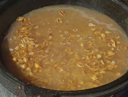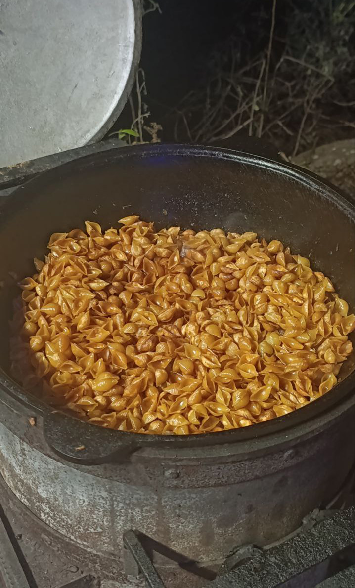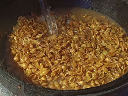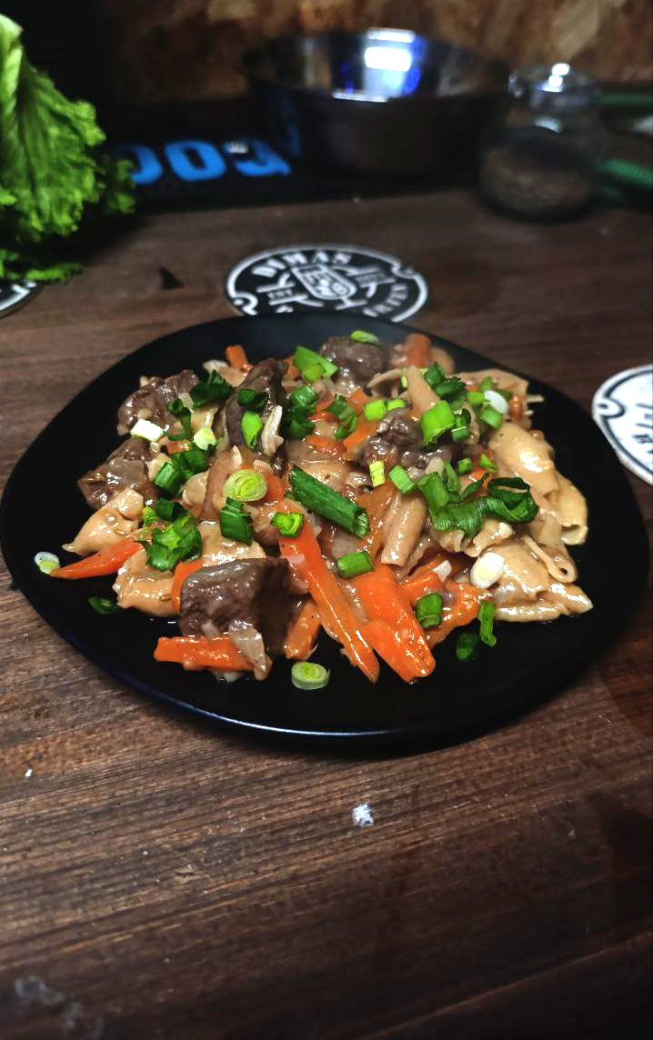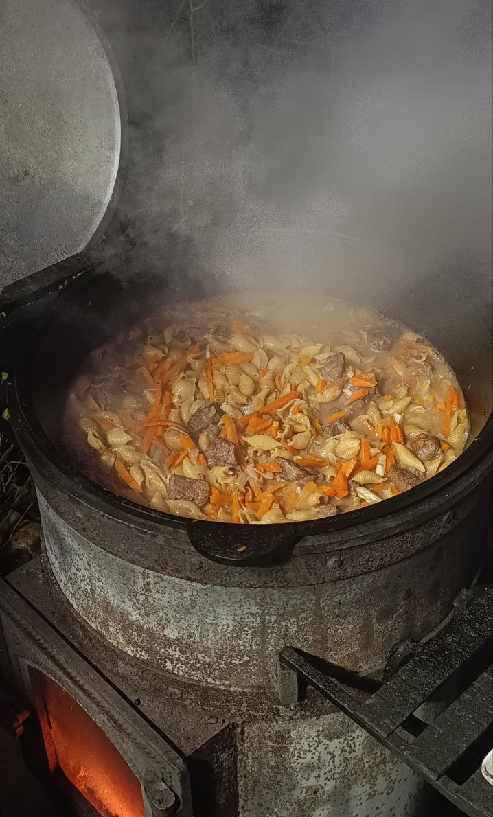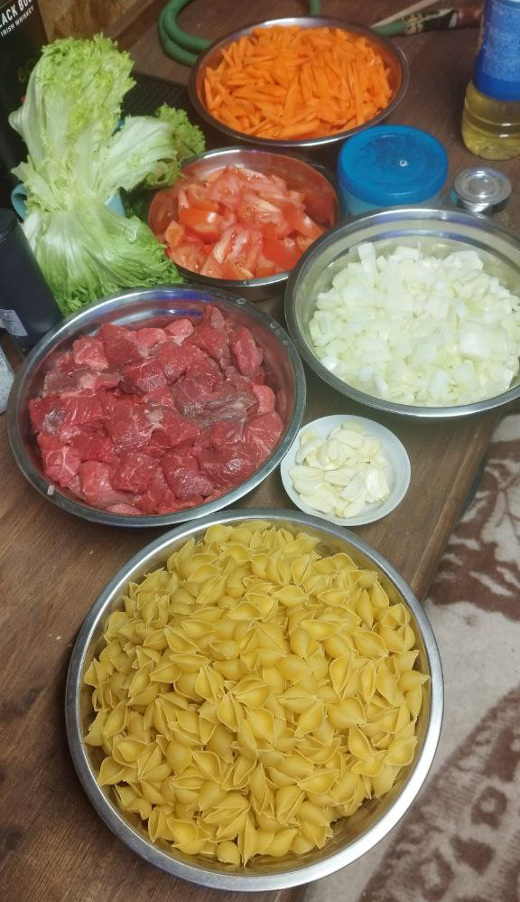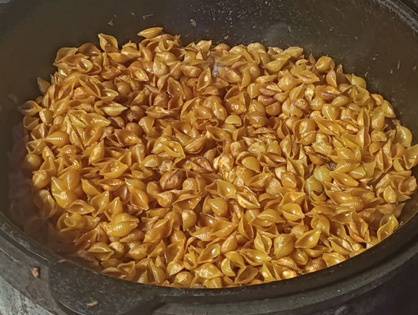 Готовое мясо засыпаем обжаренными макаронами. Присаливаем и заливаем (водой) так, чтобы жидкость покрыла макароны. Накрываем крышкой и выпариваем воду.