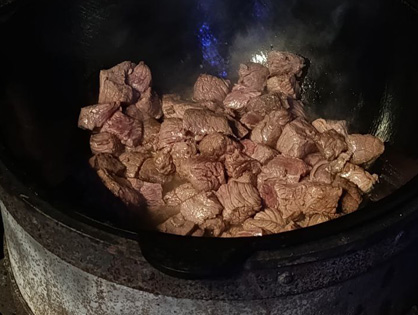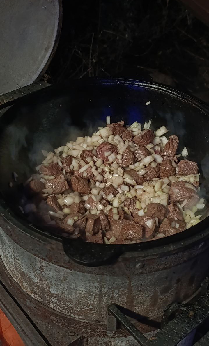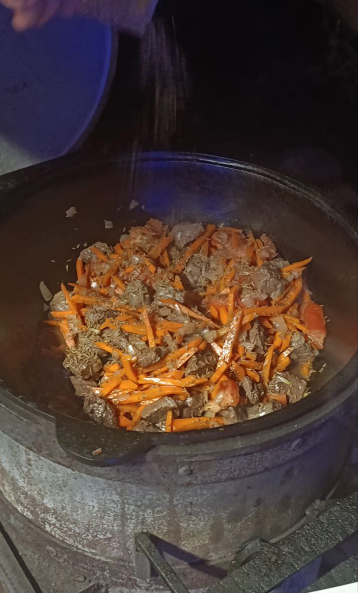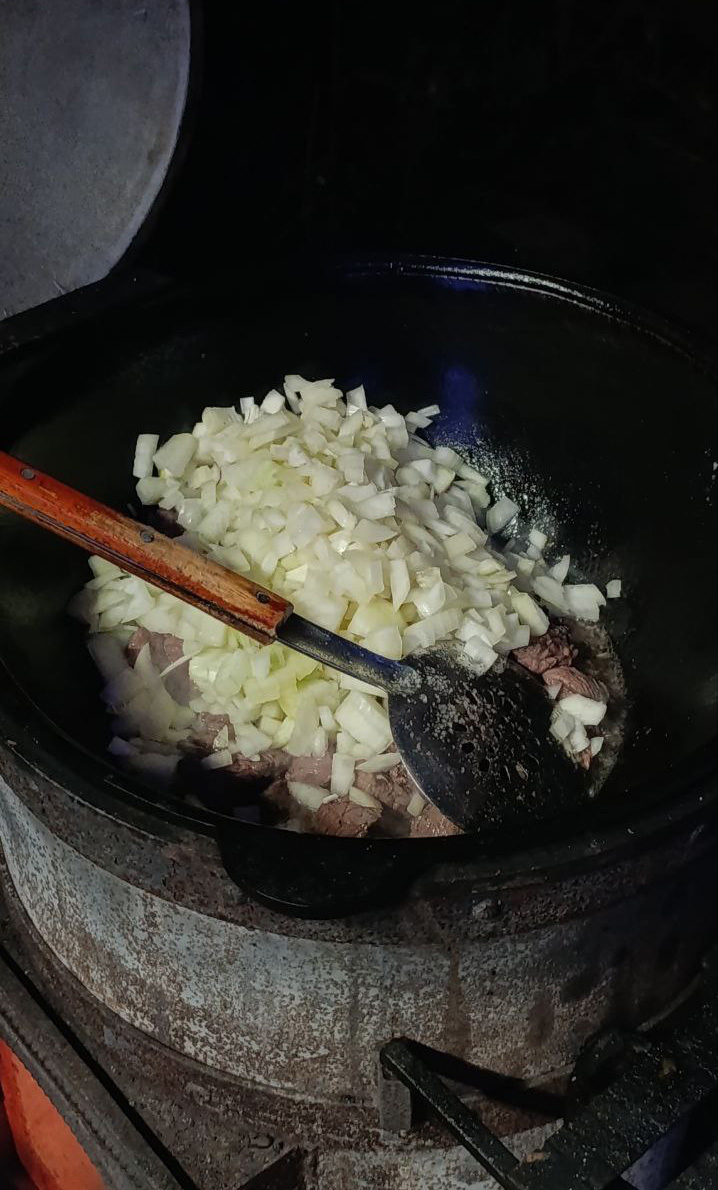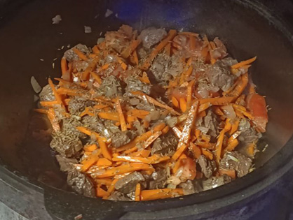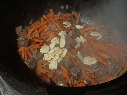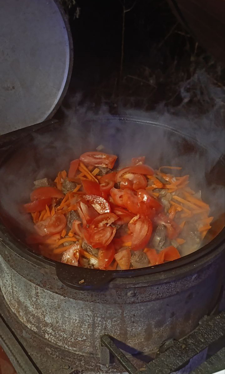 Заворачиваем мясо на большом огне, солим, перчим. Уменьшаем огонь и добавляем лук. Чуть позже морковь, зира, томаты. Тушим мясо.