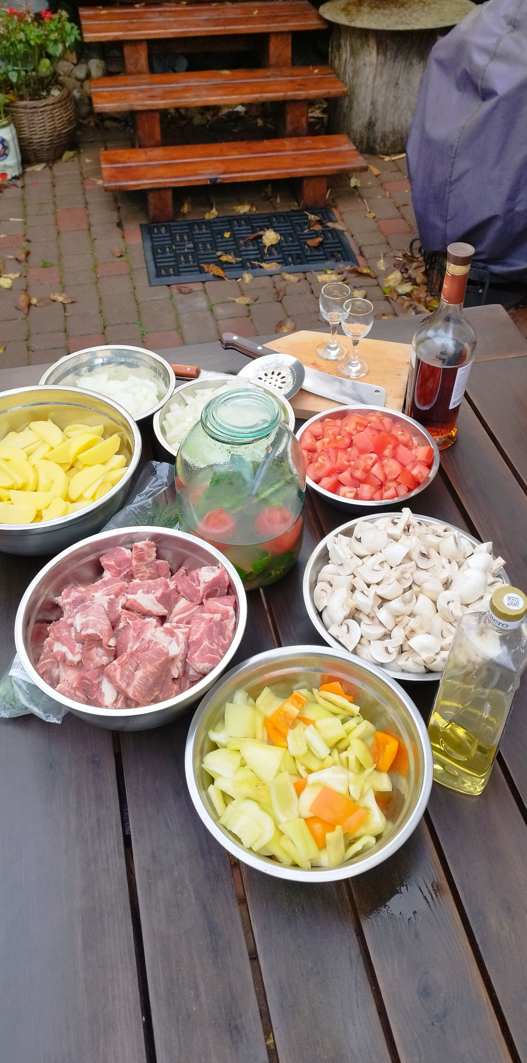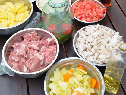 Нарезаем мясо крупными кусками, лук и томаты кубиками, картофель крупными дольками, перец крупно. Крупные шампиньоны на четыре части (средние - пополам). Рубим петрушку.