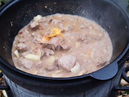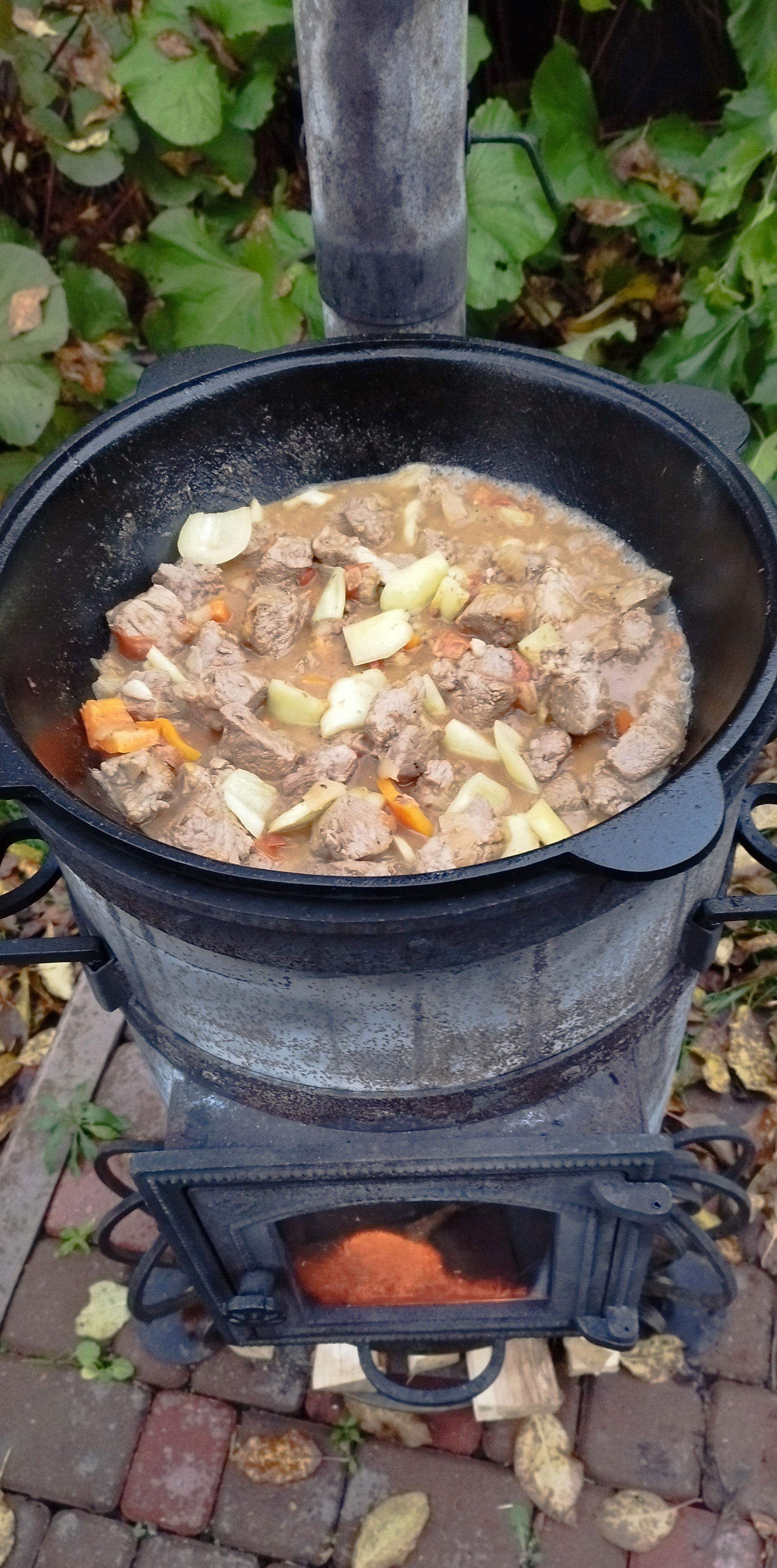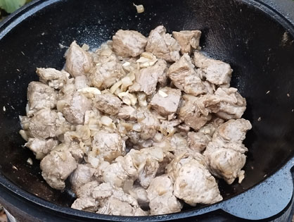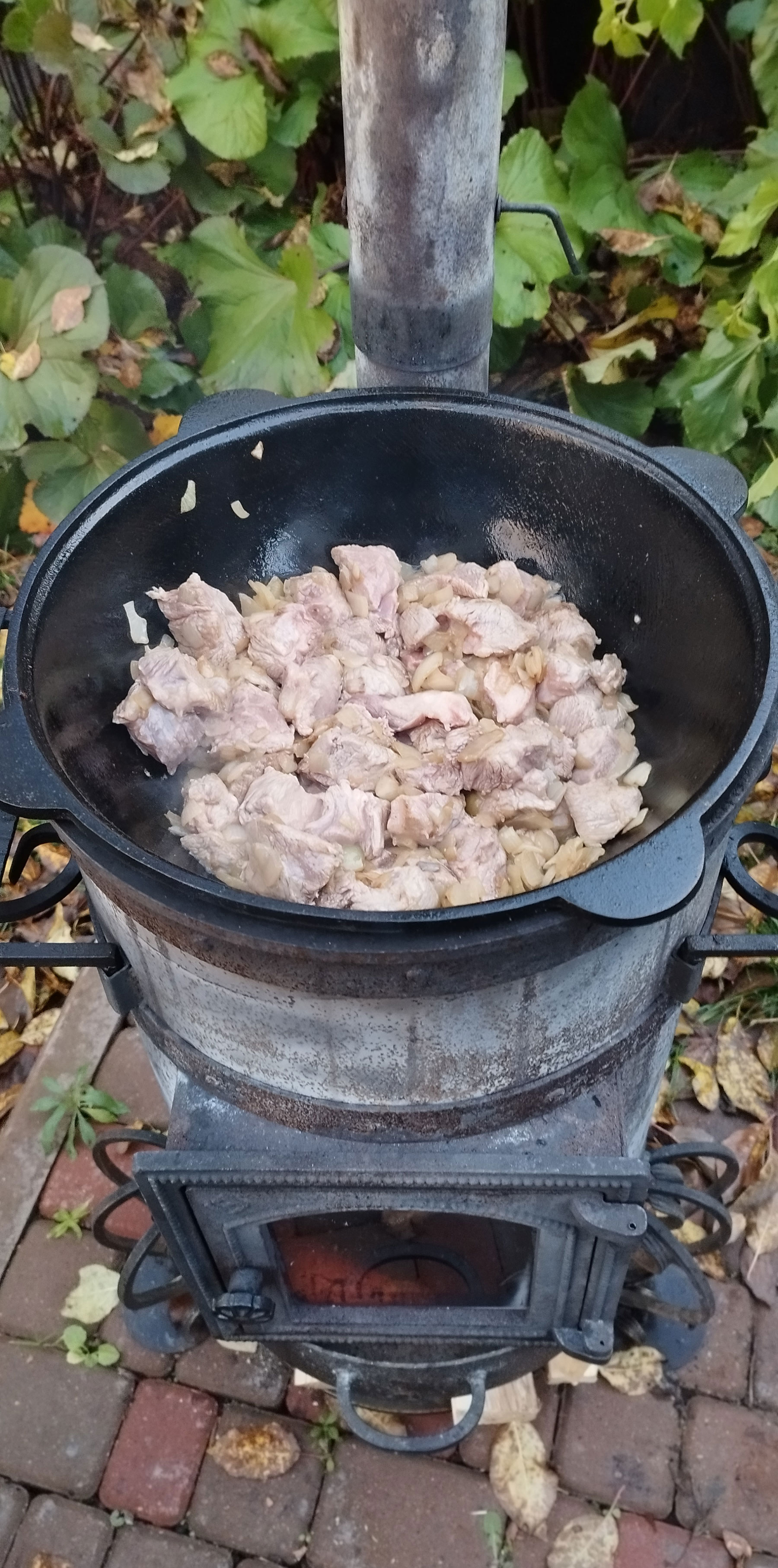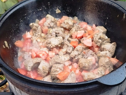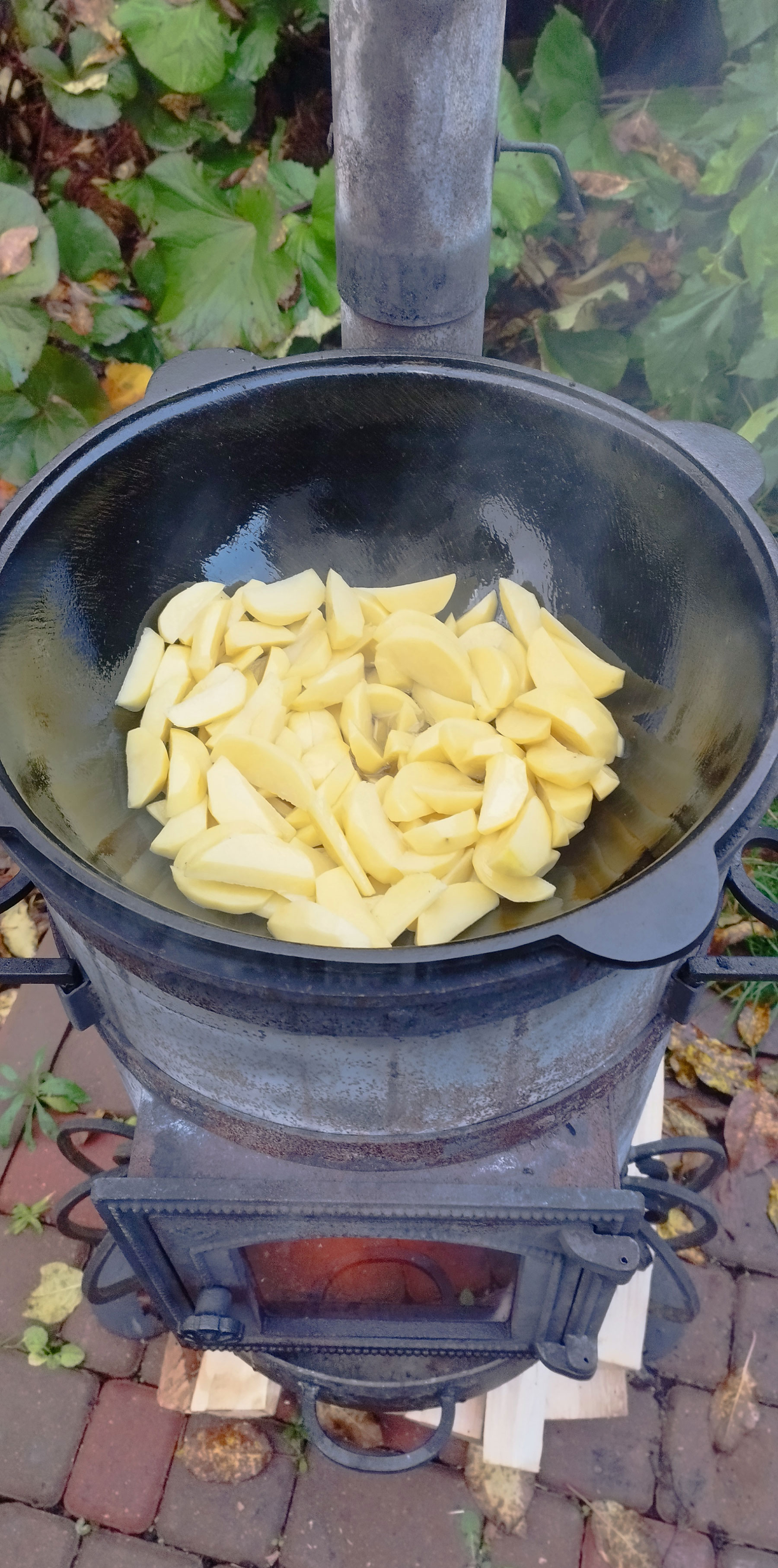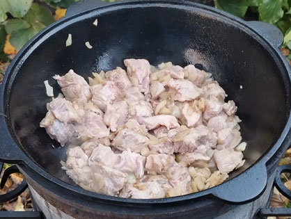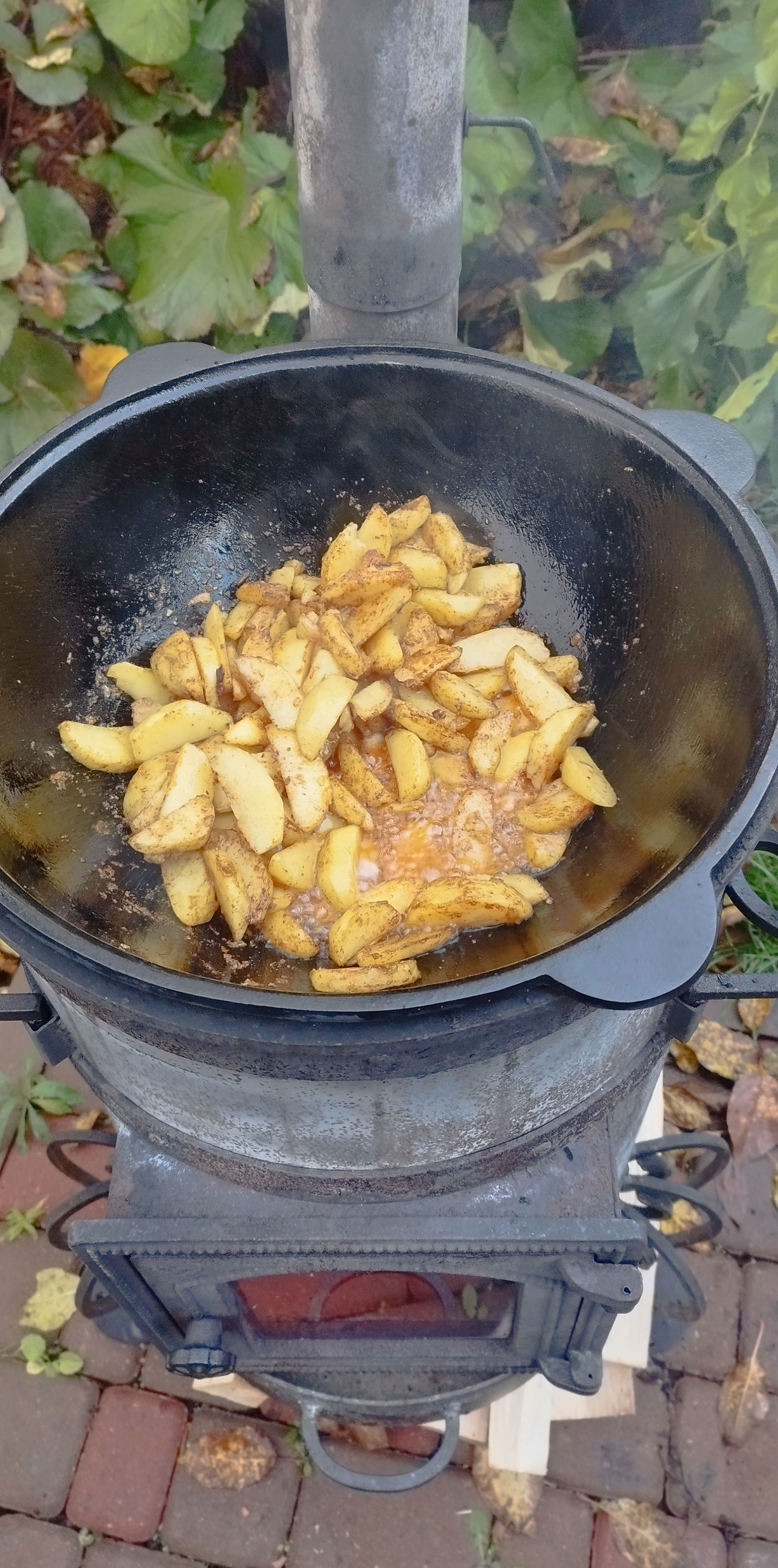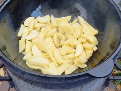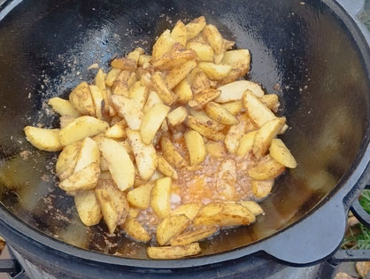 Разогреваем казан и добавляем подсолнечное масло. Добавляем картофель чуть не дожариваем. Солим, добавляем копченую паприку. Снимаем с казана.