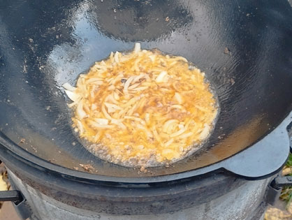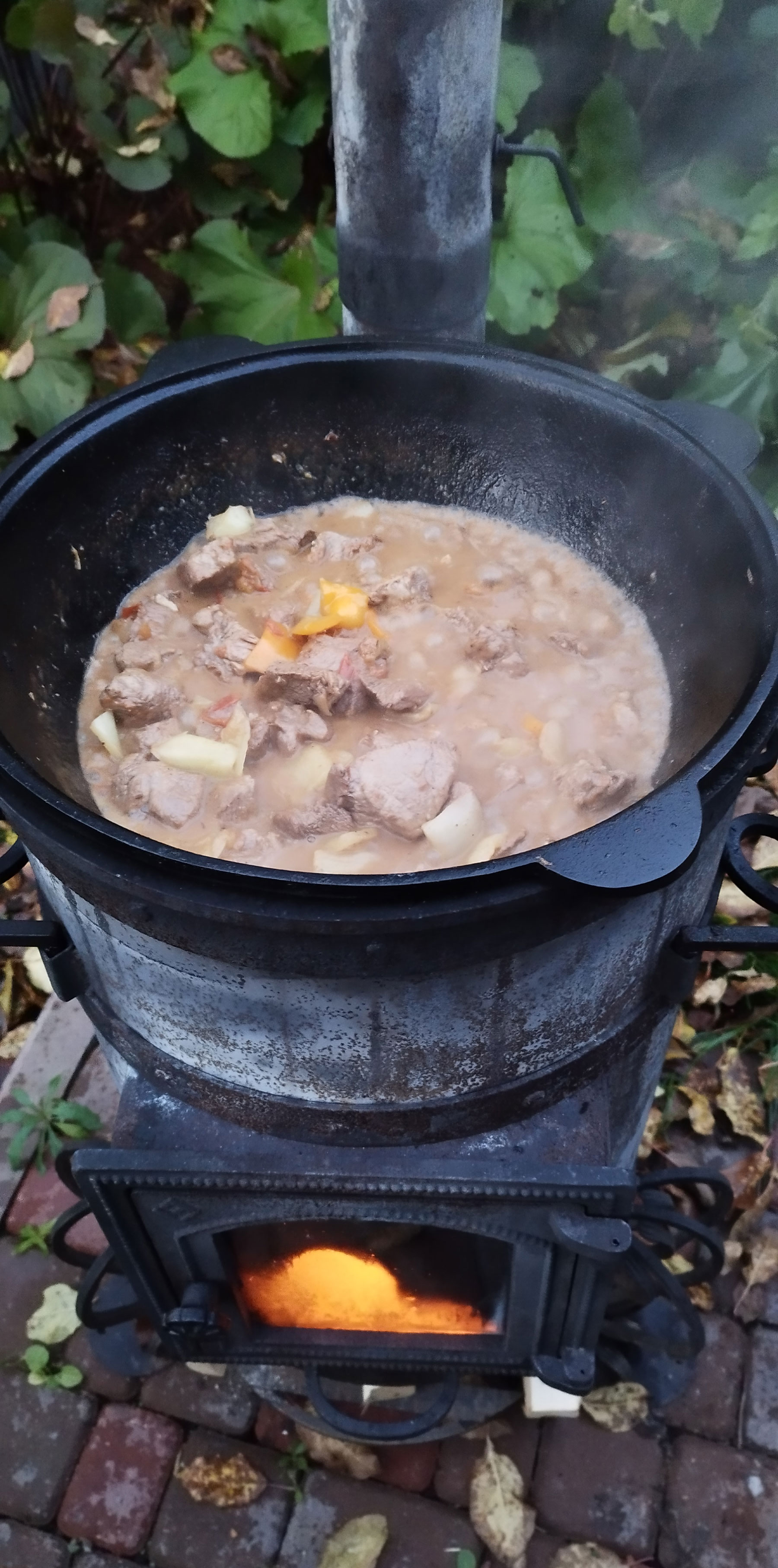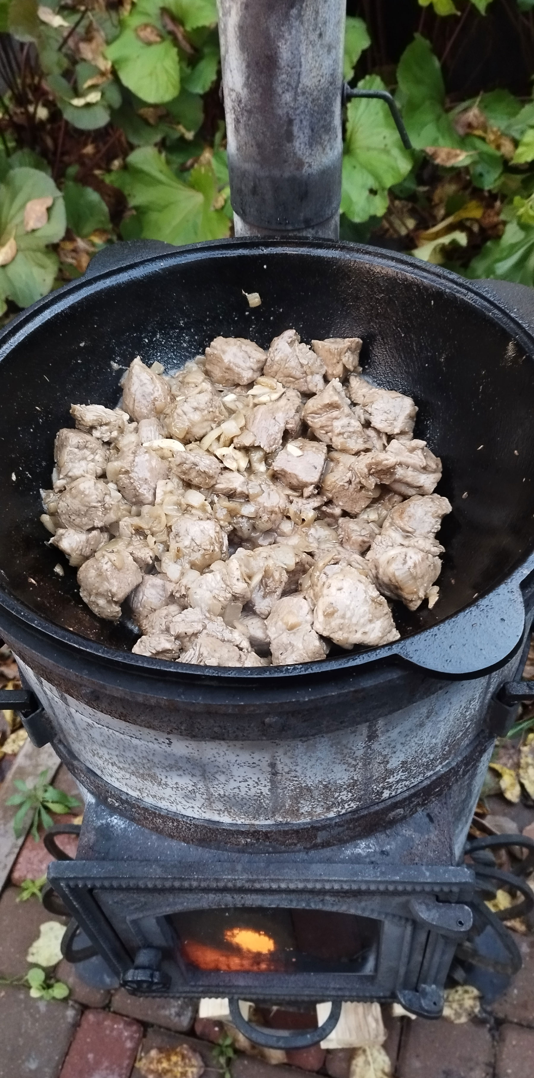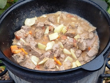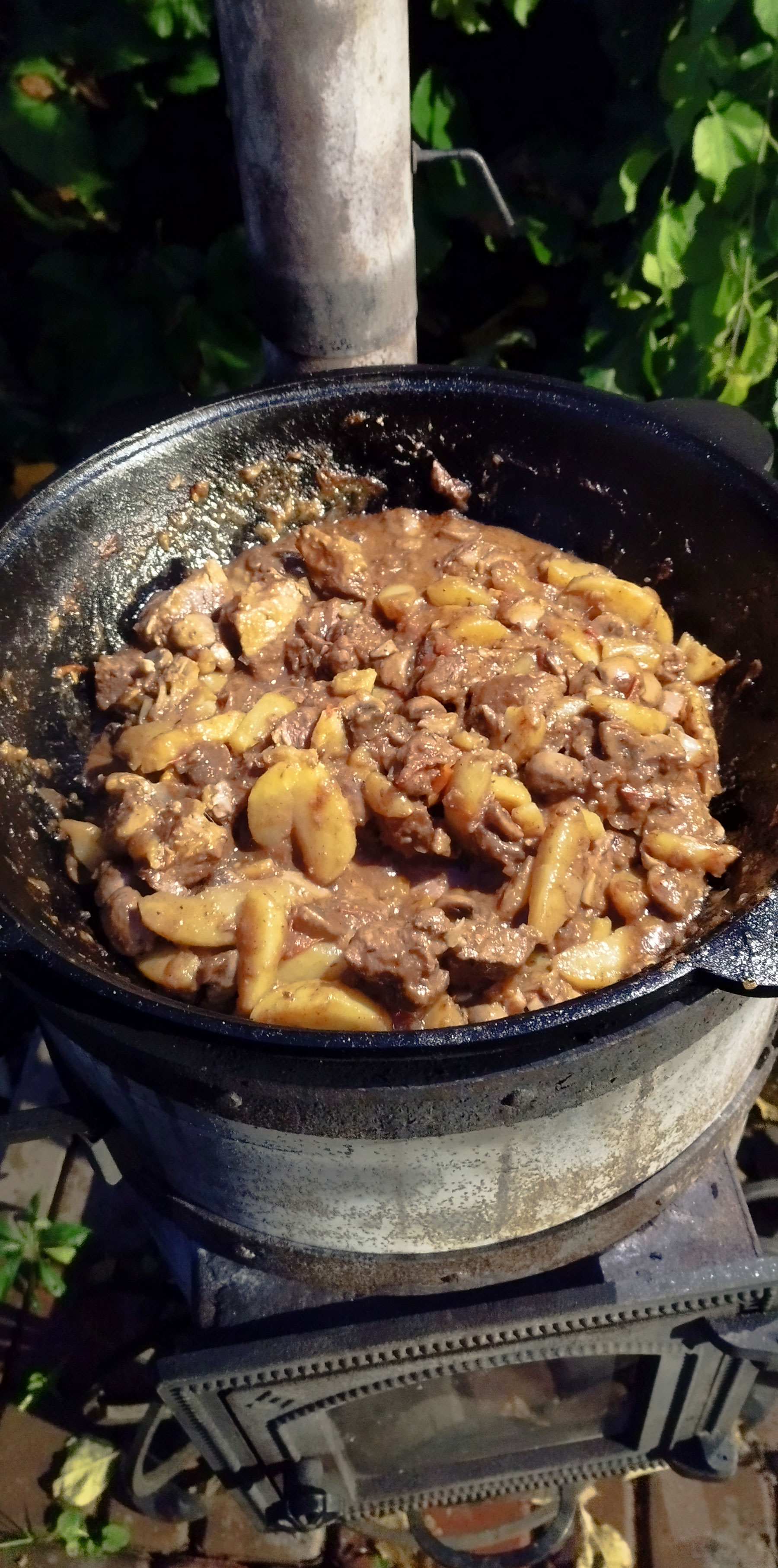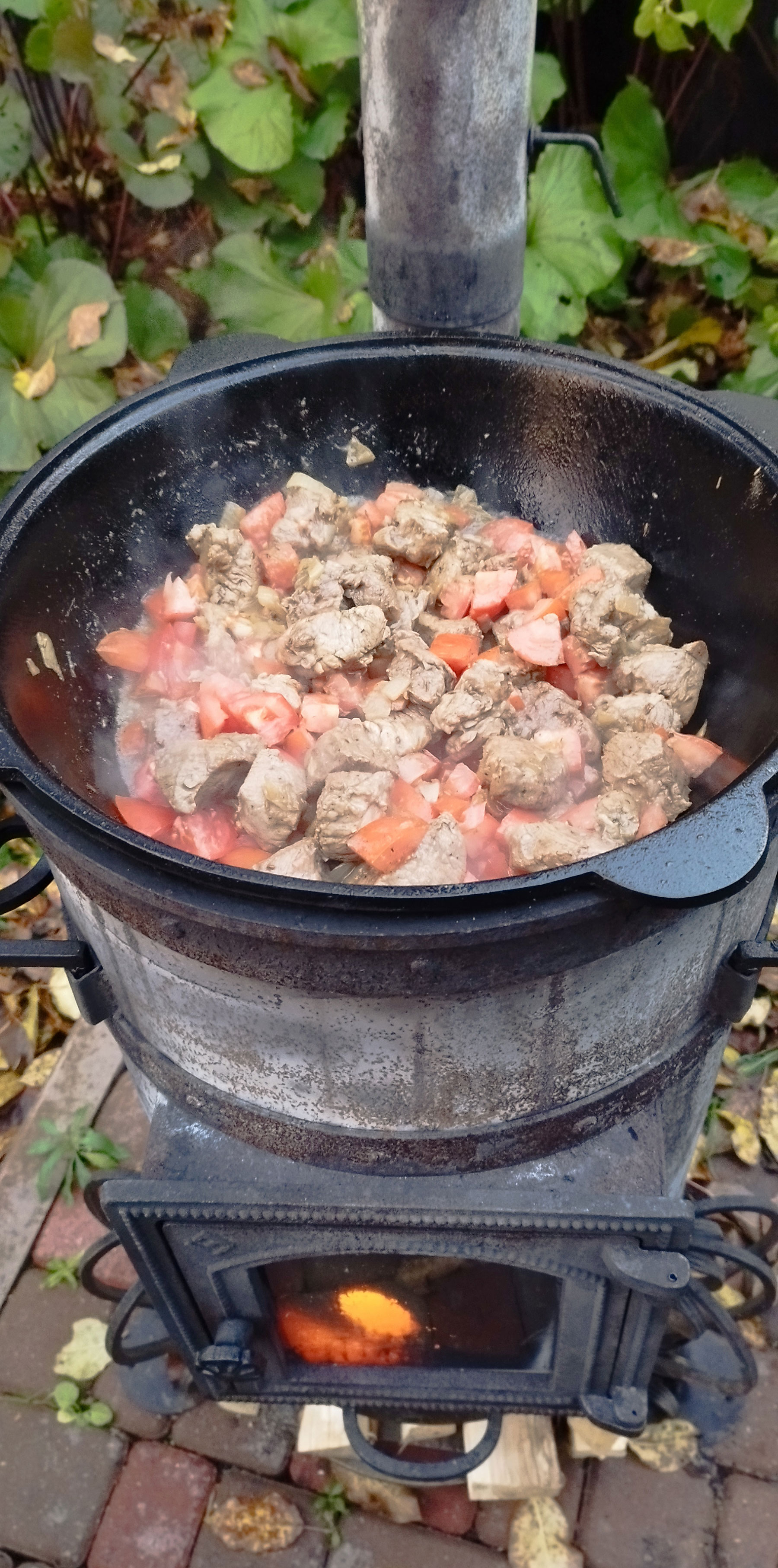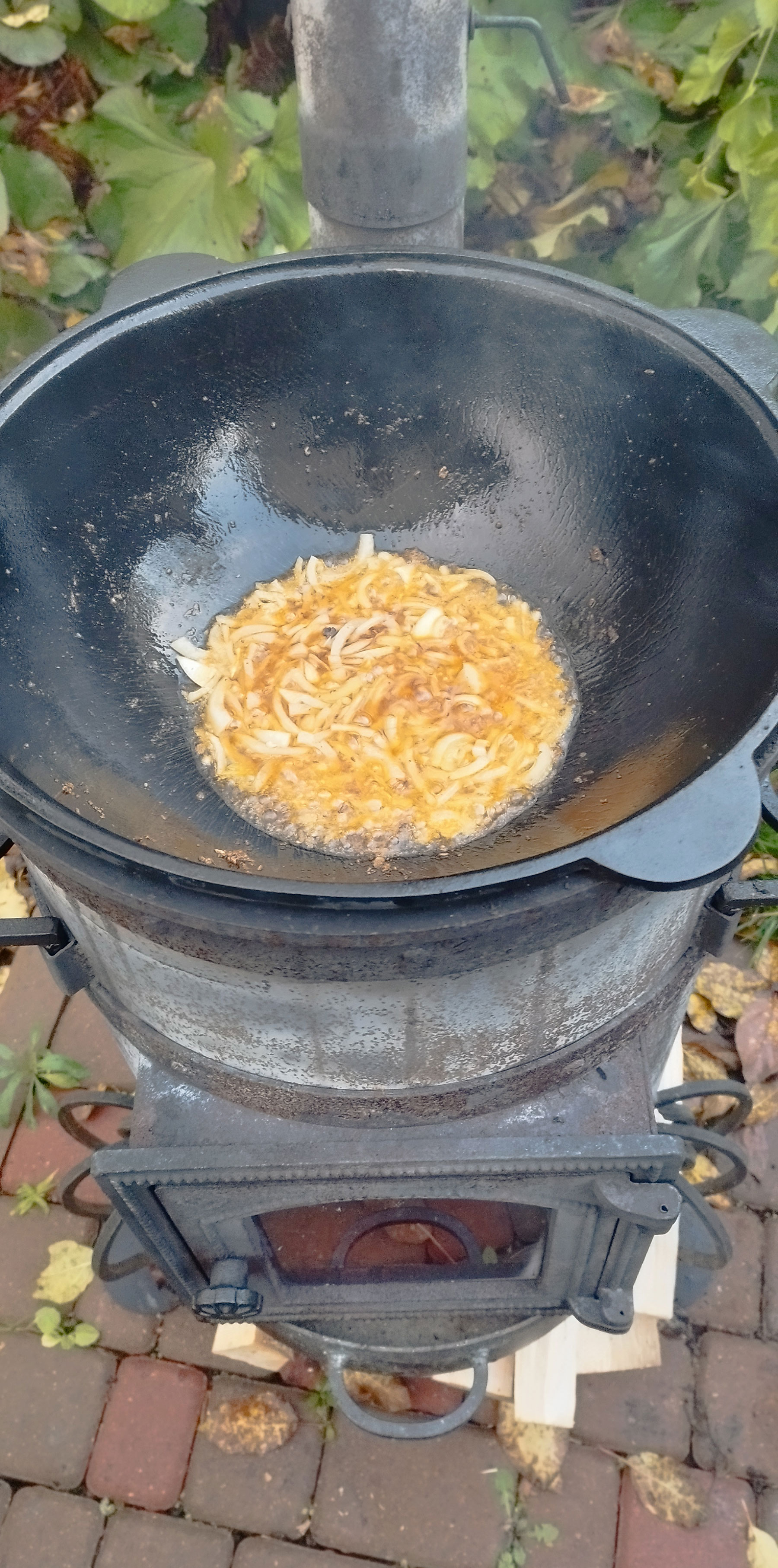 Разогреваем казан и добавляем подсолнечное масло. Добавляем картофель чуть не дожариваем. Солим, добавляем копченую паприку. Снимаем с казана.