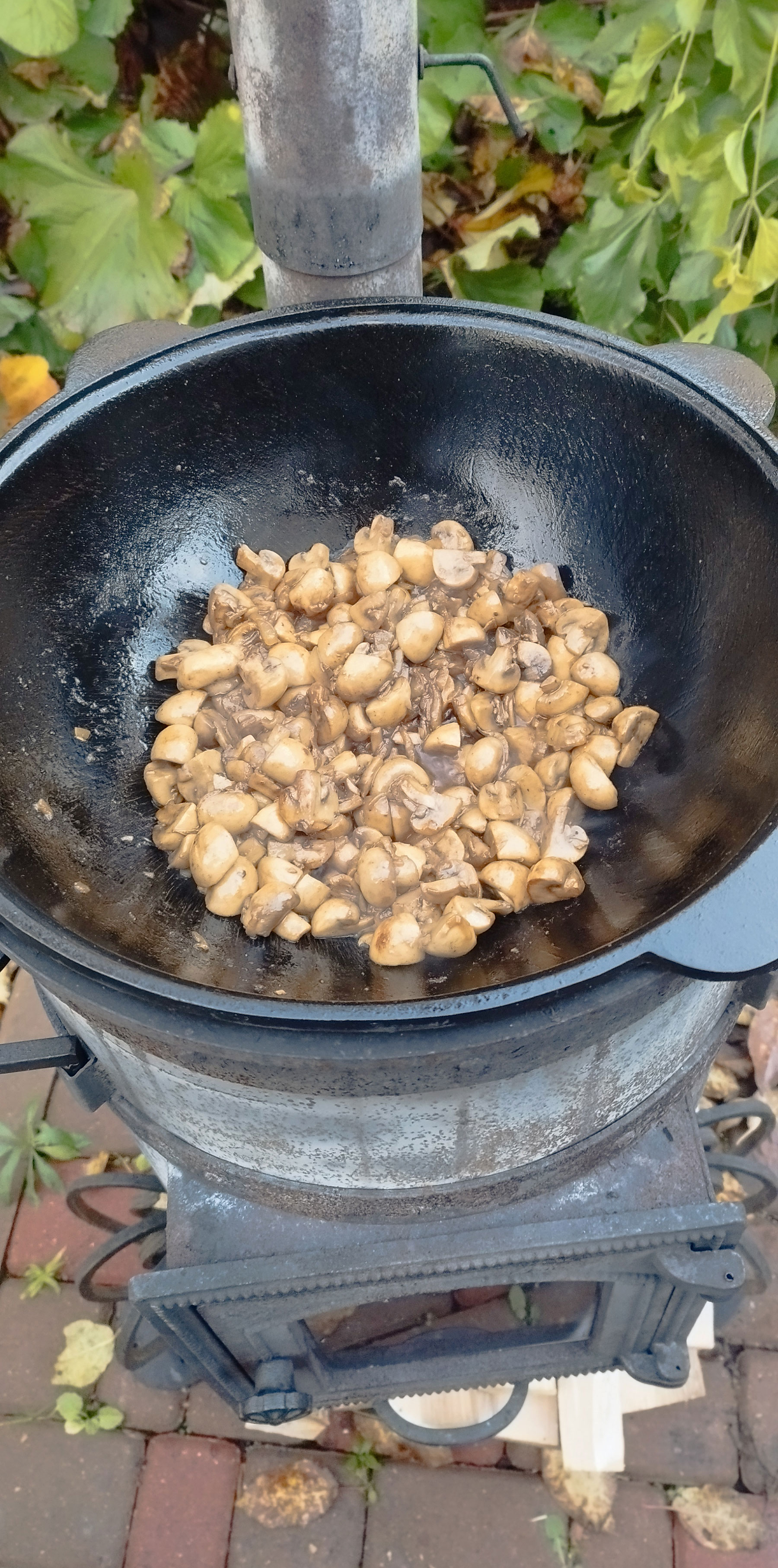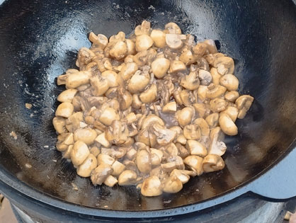 Добавляем немного масла и пассируем лук. Добавляем шампиньоны, чуть не дожариваем, солим и добавляем жаренный чеснок. Снимаем.