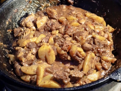 Добавляем немного масла и запечатываем мясо. Добавляем лук. Как лук начнет растворяться, добавляем томаты. Тушим под крышкой. Добавляем перец. Когда подлива начнет выпариваться, добавляем грибы и картофель. Подтушиваем все вместе 10-15 минут под крышкой.