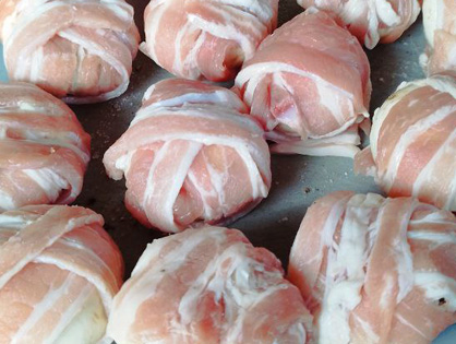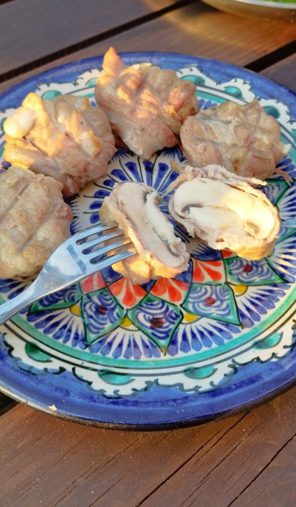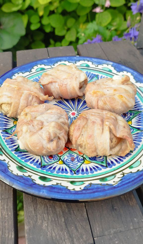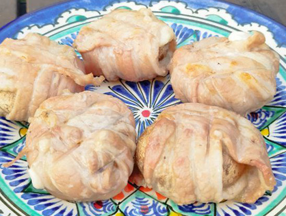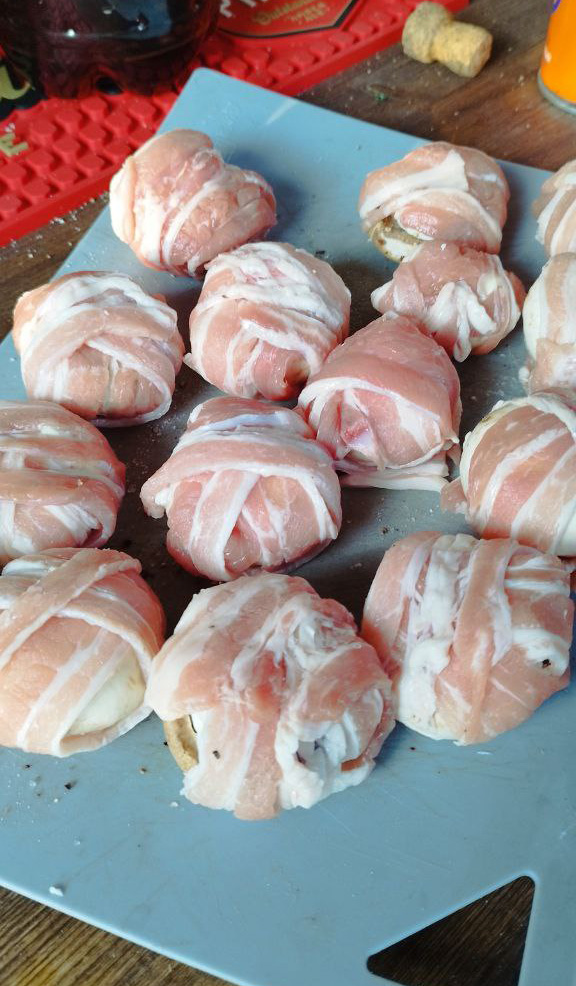 Солим/перчим бекон. Удаляем ножки шампиньонов, маринуем в соевом соусе. Вкладываем в шляпки сыр и заворачиваем грибы в бекон.