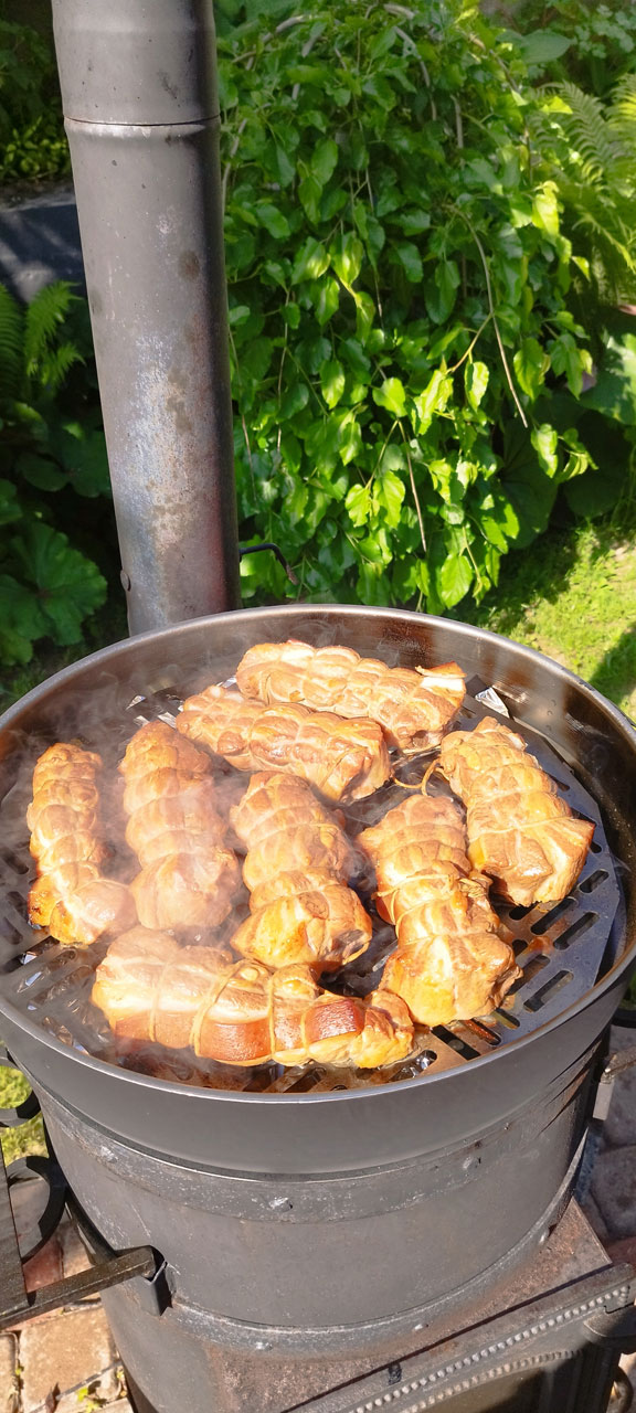 Рассол для копчения: 2ст. ложки соли, 1ч. ложка сахара, 1 литр воды. Режем грудинку на кусочки. и помещаем в рассол на ночь. На утро сушим грудинку от рассола, перематываем кухонной нитью.