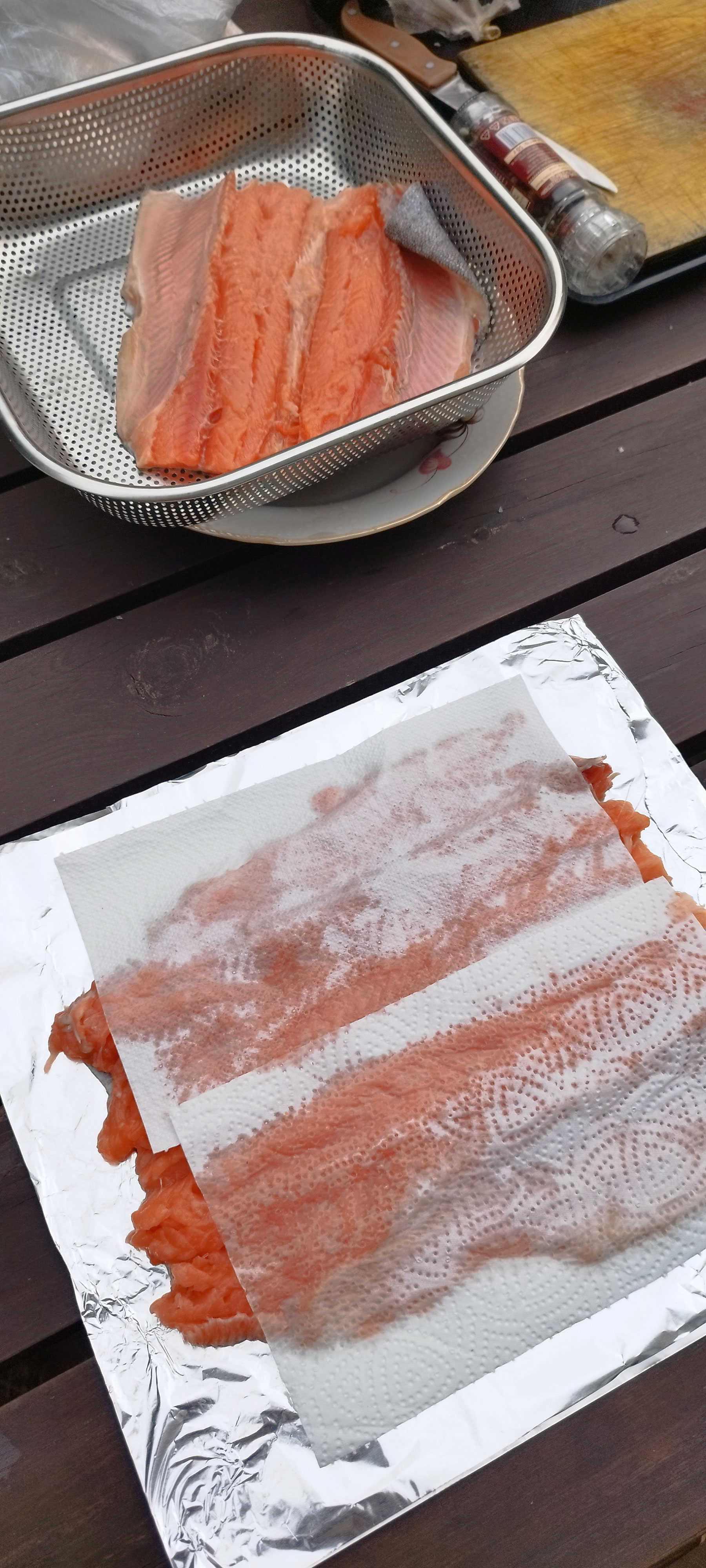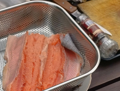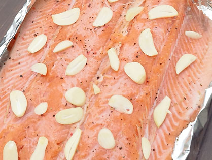 Разделываем тушки на филе. Даем подсохнуть. Солим, перчим. Сбрызгиваем соком лимона. Режем чеснок полосками и выкладываем на рыбу.