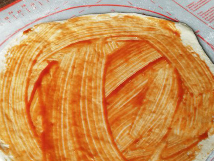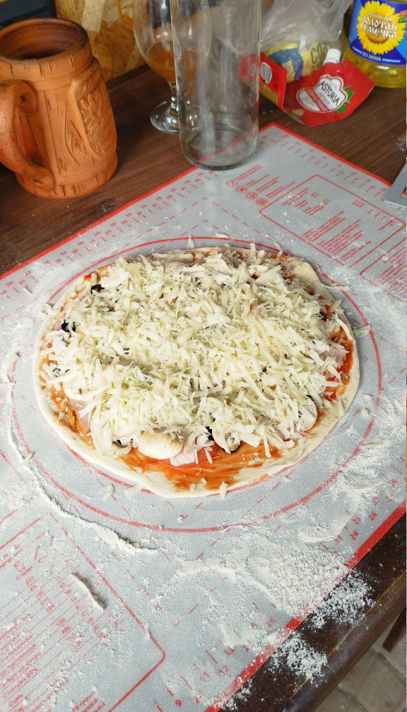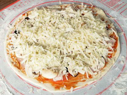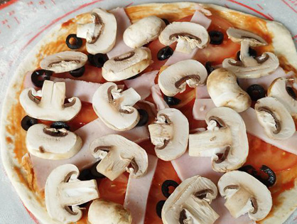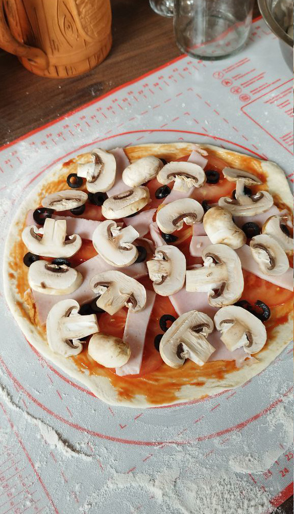 Раскатываем тесто тонким слоем, смазываем томатной пастой, выкладываем мясные нарезки, помидоды, маслины, шампиньоны. Посыпаем тертым сыром. Подворачиваем края.